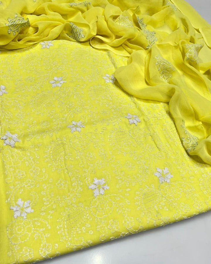 Elevate your wardrobe with this exquisite 3-piece hand embroidered lawn collection, meticulously crafted for the discerning customer. This ensemble features a premium 5-meter trouser, coordinating shirt, and 2.5-yard dupatta, each piece adorned with intricate hand embroidery that showcases traditional artistry. The breathable lawn fabric ensures comfort in warm climates while maintaining an elegant silhouette. Perfect for formal occasions, celebrations, or everyday sophistication, this collection combines timeless craftsmanship with contemporary style. Each garment is designed to complement one another, creating a cohesive, polished look that reflects refined taste and cultural heritage.