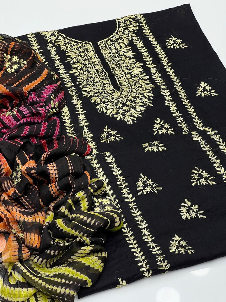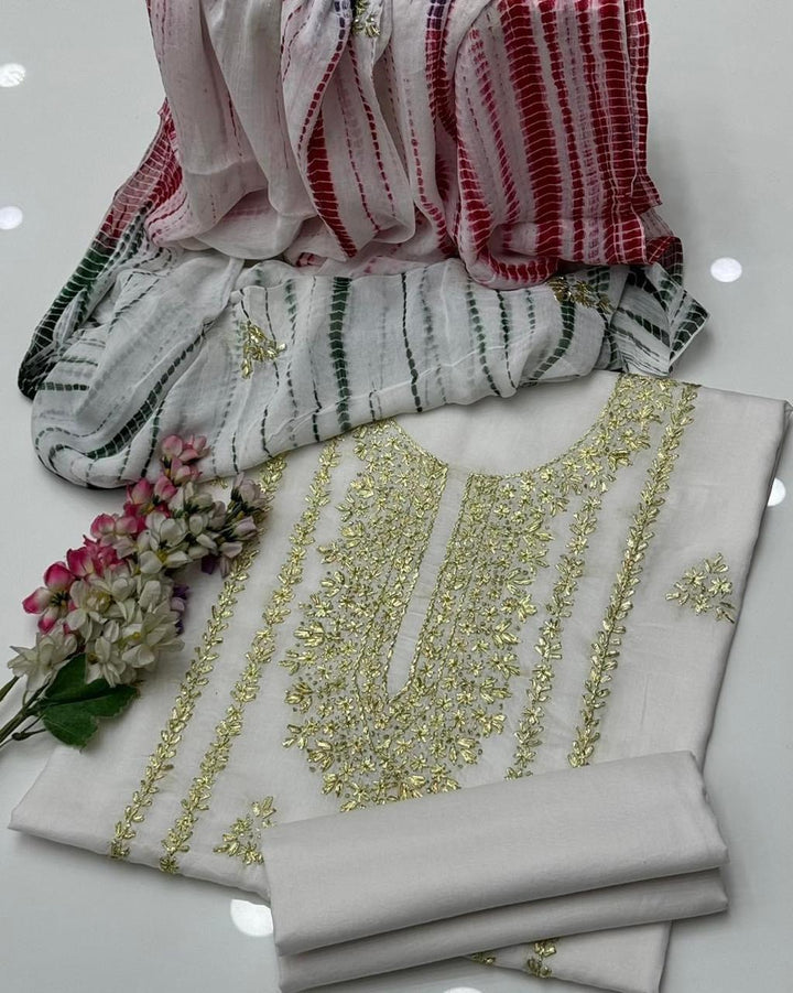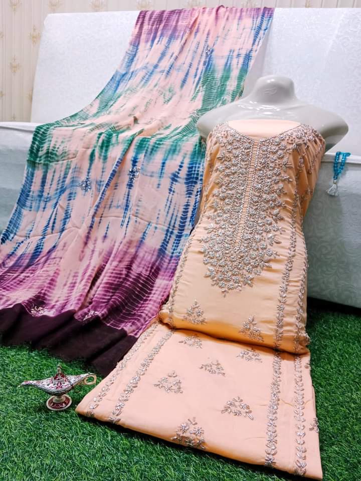 Elevate your wardrobe with this exquisite 3-piece hand embroidered lawn collection, meticulously crafted for the discerning customer. This ensemble features a premium 5-meter trouser, coordinating shirt, and 2.5-yard dupatta, each piece adorned with intricate hand embroidery that showcases traditional artistry. The breathable lawn fabric ensures comfort in warm climates while maintaining an elegant silhouette. Perfect for formal occasions, celebrations, or everyday sophistication, this collection combines timeless craftsmanship with contemporary style. Each garment is designed to complement one another, creating a cohesive, polished look that reflects refined taste and cultural heritage.