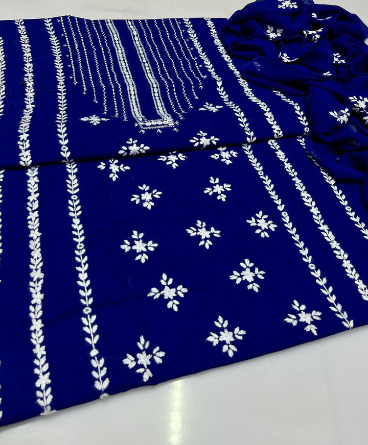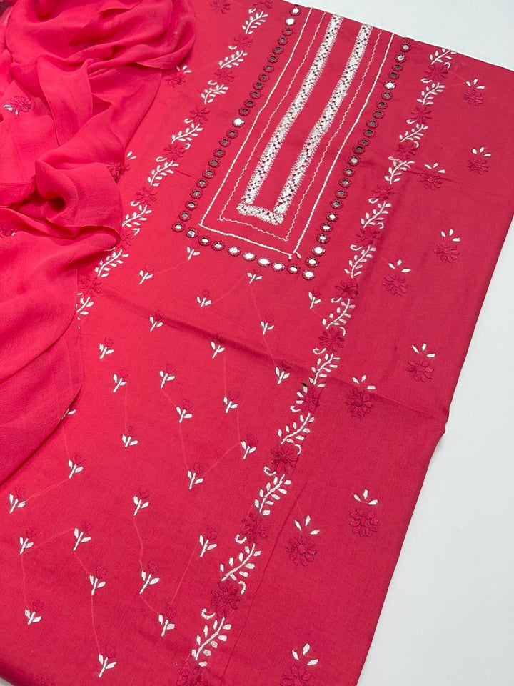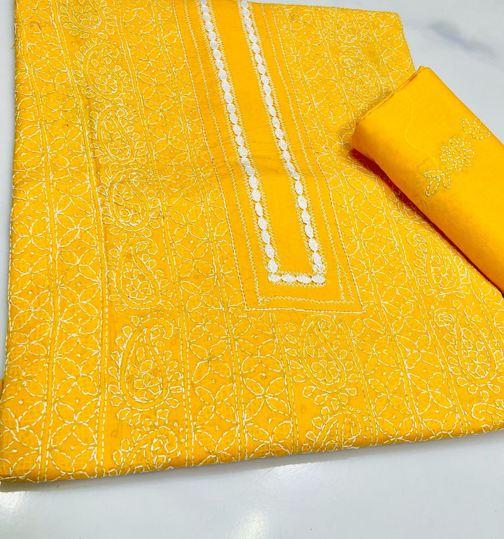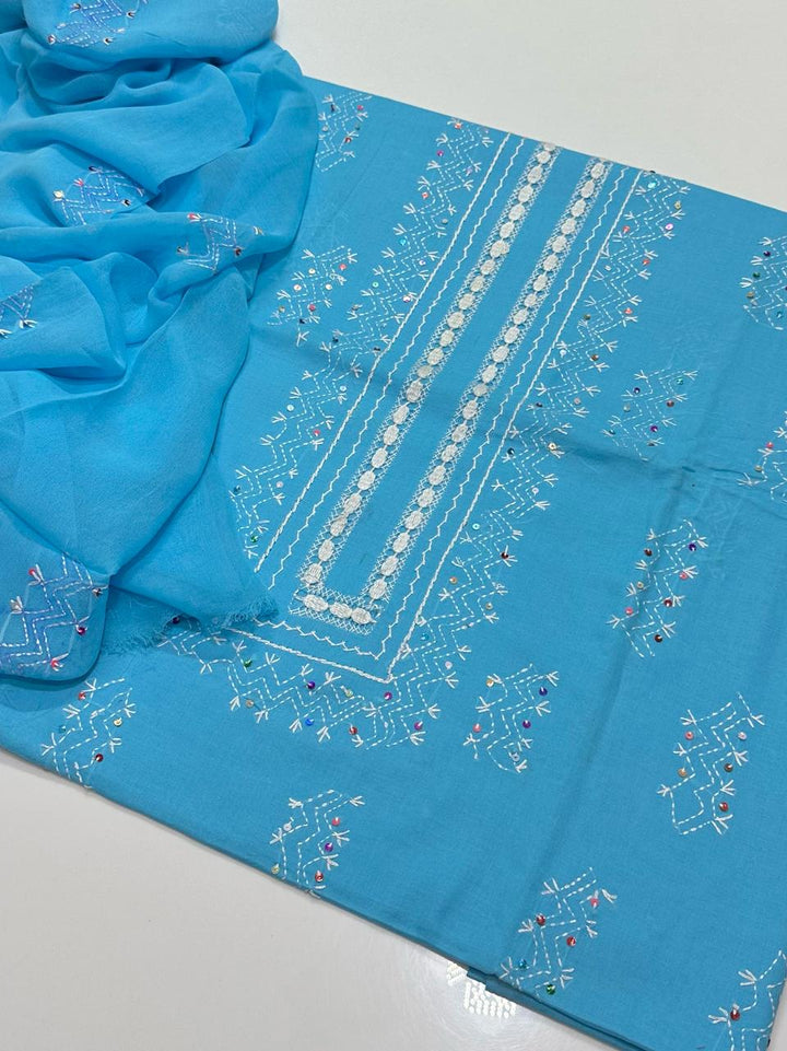 Elevate your wardrobe with this exquisite 3-piece hand embroidered lawn collection, meticulously crafted for the discerning customer. This ensemble features a premium 5-meter trouser, coordinating shirt, and 2.5-yard dupatta, each piece adorned with intricate hand embroidery that showcases traditional artistry. The breathable lawn fabric ensures comfort in warm climates while maintaining an elegant silhouette. Perfect for formal occasions, celebrations, or everyday sophistication, this collection combines timeless craftsmanship with contemporary style. Each garment is designed to complement one another, creating a cohesive, polished look that reflects refined taste and cultural heritage.