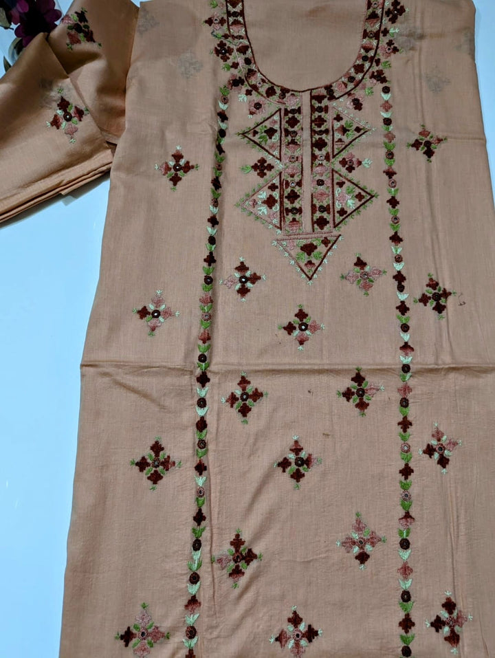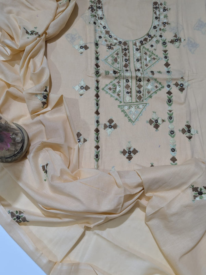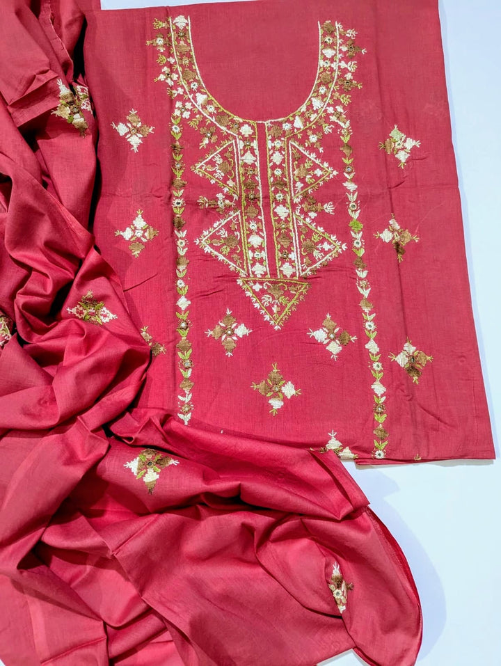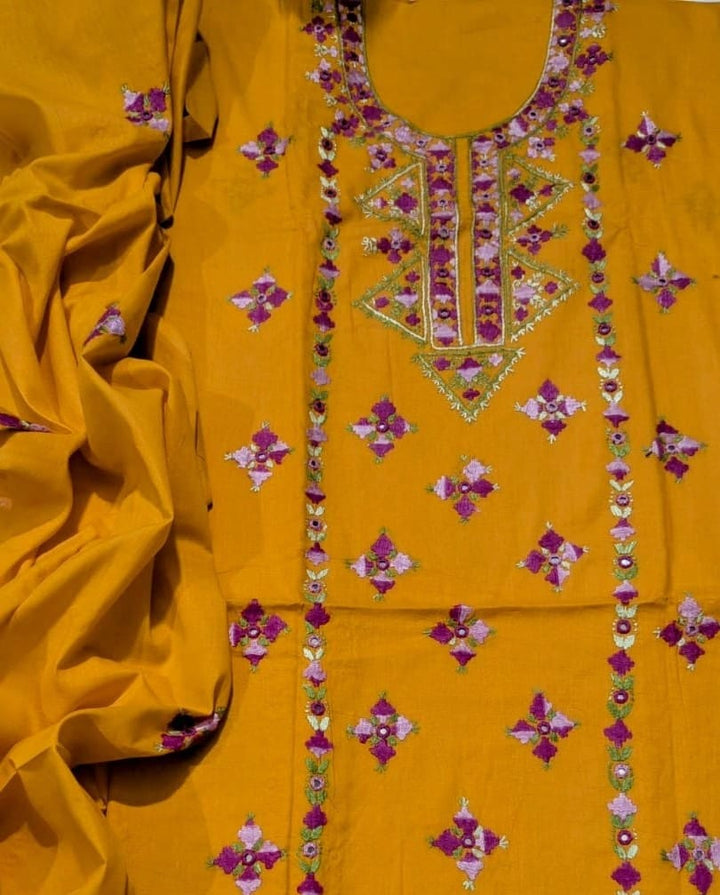 Elevate your wardrobe with this exquisite 3-piece hand embroidered lawn collection, meticulously crafted for the discerning customer. This ensemble features a premium 5-meter trouser, coordinating shirt, and 2.5-yard dupatta, each piece adorned with intricate hand embroidery that showcases traditional artistry. The breathable lawn fabric ensures comfort in warm climates while maintaining an elegant silhouette. Perfect for formal occasions, celebrations, or everyday sophistication, this collection combines timeless craftsmanship with contemporary style. Each garment is designed to complement one another, creating a cohesive, polished look that reflects refined taste and cultural heritage.