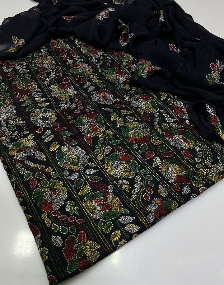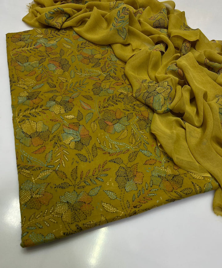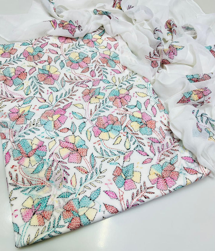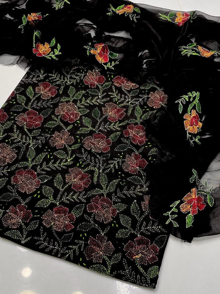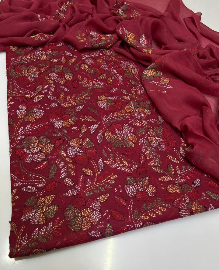 Elevate your wardrobe with this exquisite 3-piece hand embroidered lawn collection, meticulously crafted for the discerning customer. This ensemble features a premium 5-meter trouser, coordinating shirt, and 2.5-yard dupatta, each piece adorned with intricate hand embroidery that showcases traditional artistry. The breathable lawn fabric ensures comfort in warm climates while maintaining an elegant silhouette. Perfect for formal occasions, celebrations, or everyday sophistication, this collection combines timeless craftsmanship with contemporary style. Each garment is designed to complement one another, creating a cohesive, polished look that reflects refined taste and cultural heritage.