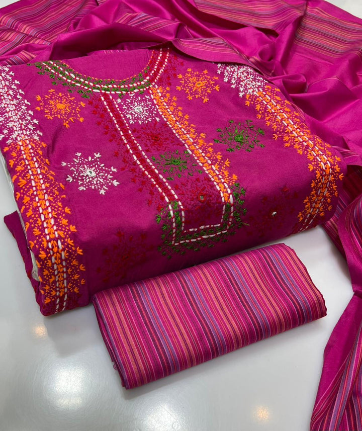Elevate your wardrobe with this exquisite 3-piece hand embroidered lawn collection, meticulously crafted for the discerning customer. This ensemble features a premium 5-meter trouser, coordinating shirt, and 2.5-yard dupatta, each piece adorned with intricate hand embroidery that showcases traditional artistry. The breathable lawn fabric ensures comfort in warm climates while maintaining an elegant silhouette. Perfect for formal occasions, celebrations, or everyday sophistication, this collection combines timeless craftsmanship with contemporary style. Each garment is designed to complement one another, creating a cohesive, polished look that reflects refined taste and cultural heritage.