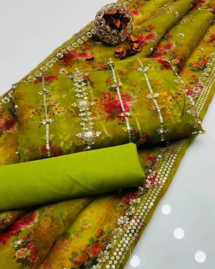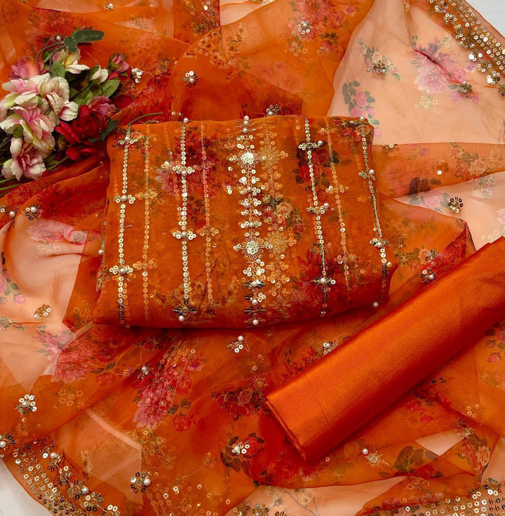Elevate your celebration wardrobe with this exquisite three-piece ensemble crafted from premium organza. Featuring sophisticated digital printing paired with delicate pearl embroidery detailing, this collection seamlessly blends contemporary design with traditional craftsmanship. The lightweight, breathable organza fabric ensures comfort throughout your event, while the intricate embellishments add an unmistakable touch of elegance. Perfect for weddings, formal gatherings, and special occasions, this versatile set offers refined styling that commands attention. Experience the perfect balance of luxury and wearability with every wear.