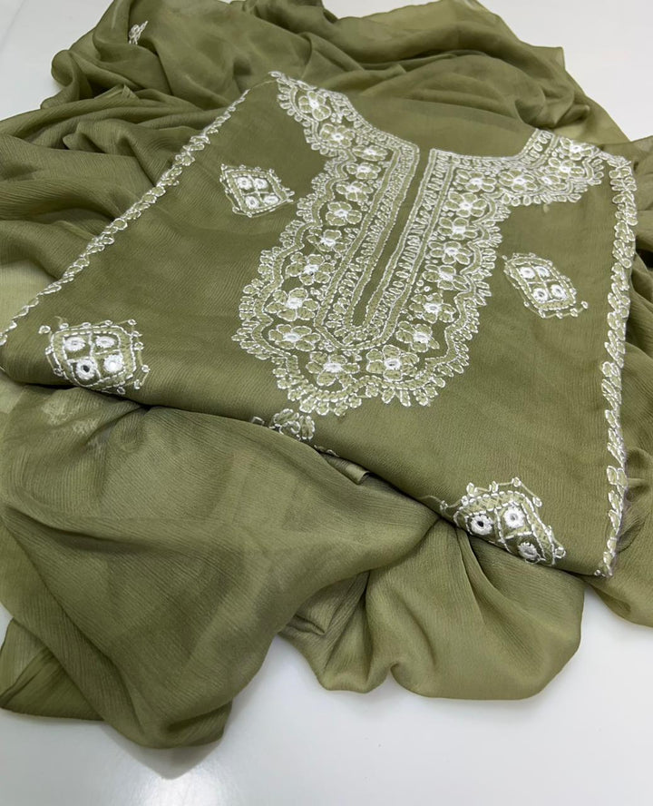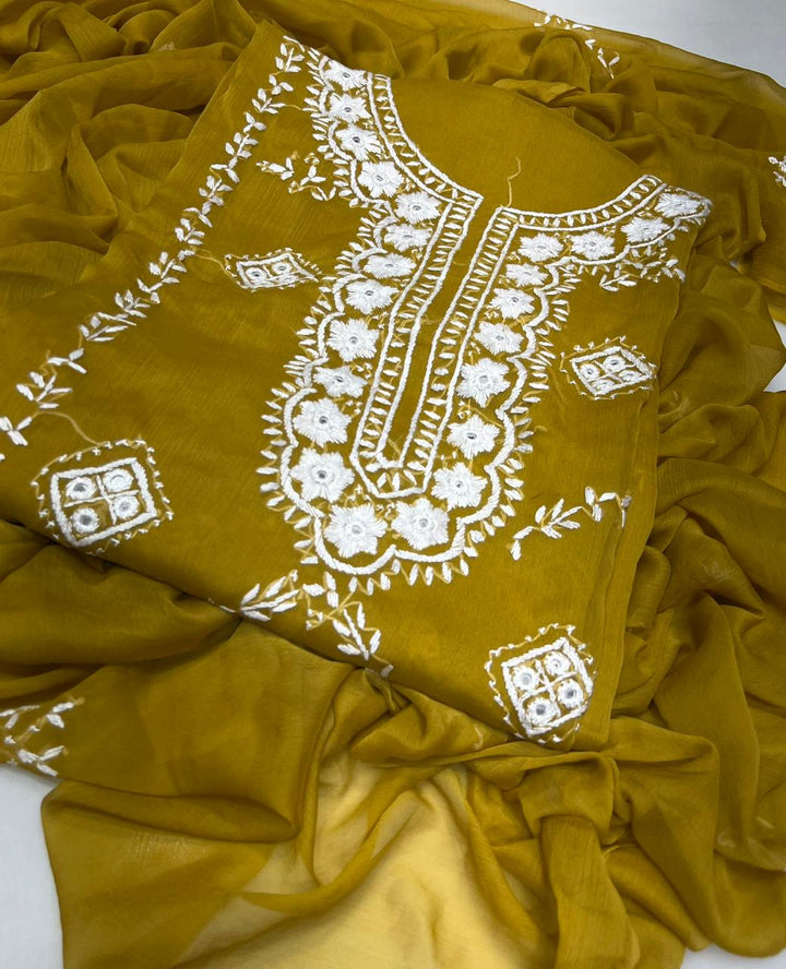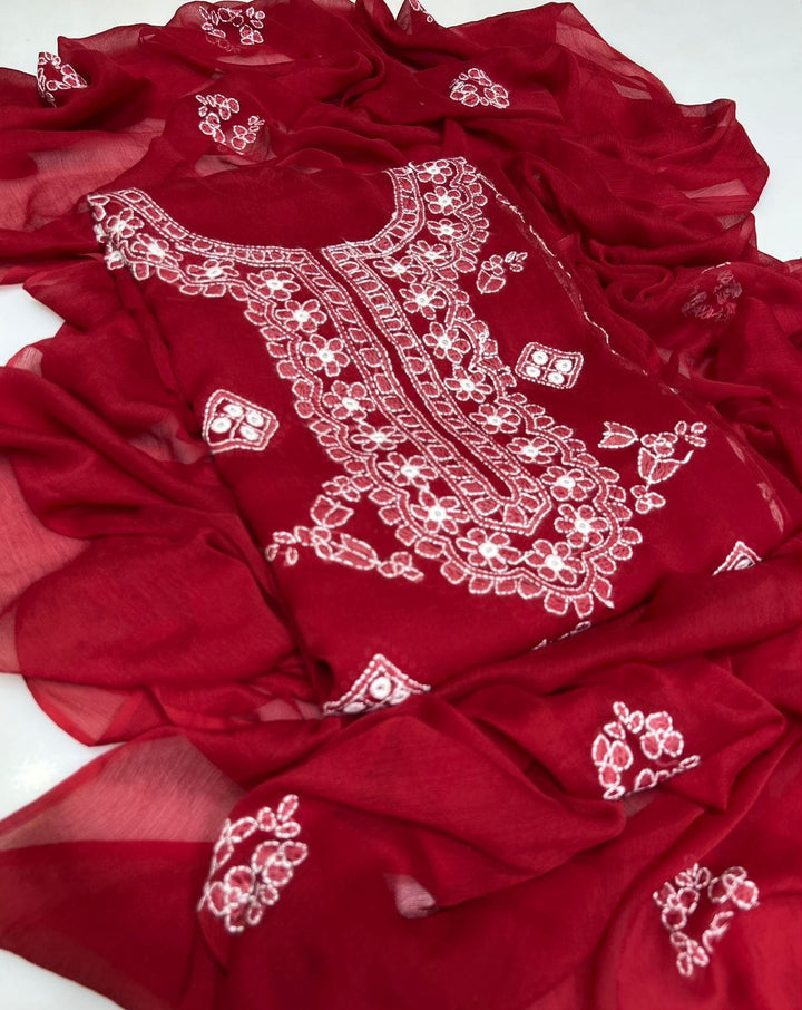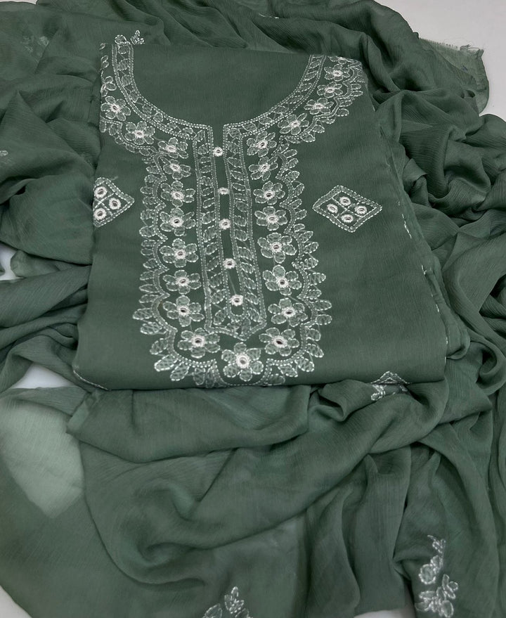 Embrace refined elegance with this premium handmade embroidered chiffon suit, expertly tailored for festive celebrations and semi-formal events. This 2-piece collection features 3 meters of intricately embroidered soft Bamber chiffon shirt paired with a generous dhai gaz dupata, offering both style and practicality. The delicate star embroidery showcases traditional craftsmanship, while the lightweight, breathable fabric ensures all-day comfort and graceful movement. Ideal for weddings, formal gatherings, and special occasions, this suit combines authentic handwork with contemporary design sensibilities, making it a distinguished addition to any formal wardrobe.