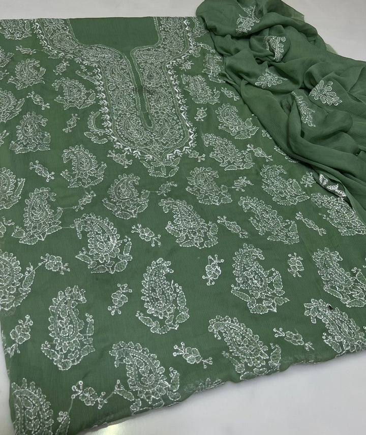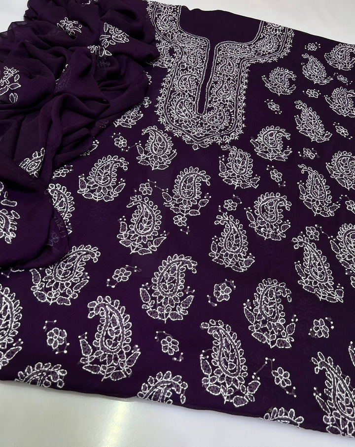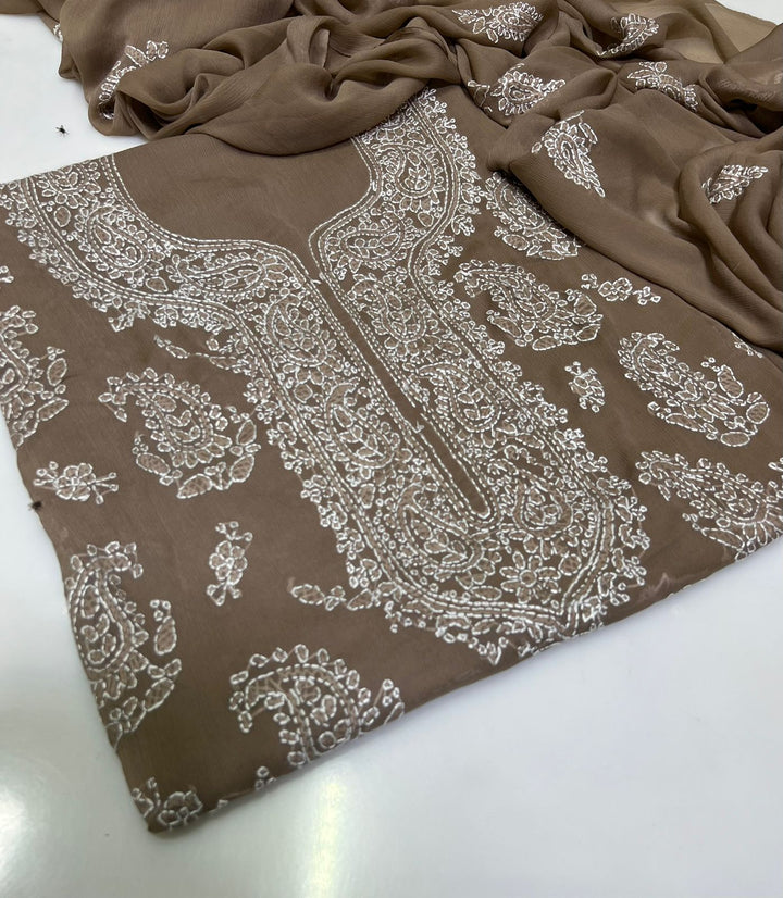 Embrace refined elegance with this premium handmade embroidered chiffon suit, expertly tailored for festive celebrations and semi-formal events. This 2-piece collection features 3 meters of intricately embroidered soft Bamber chiffon shirt paired with a generous dhai gaz dupata, offering both style and practicality. The delicate star embroidery showcases traditional craftsmanship, while the lightweight, breathable fabric ensures all-day comfort and graceful movement. Ideal for weddings, formal gatherings, and special occasions, this suit combines authentic handwork with contemporary design sensibilities, making it a distinguished addition to any formal wardrobe.