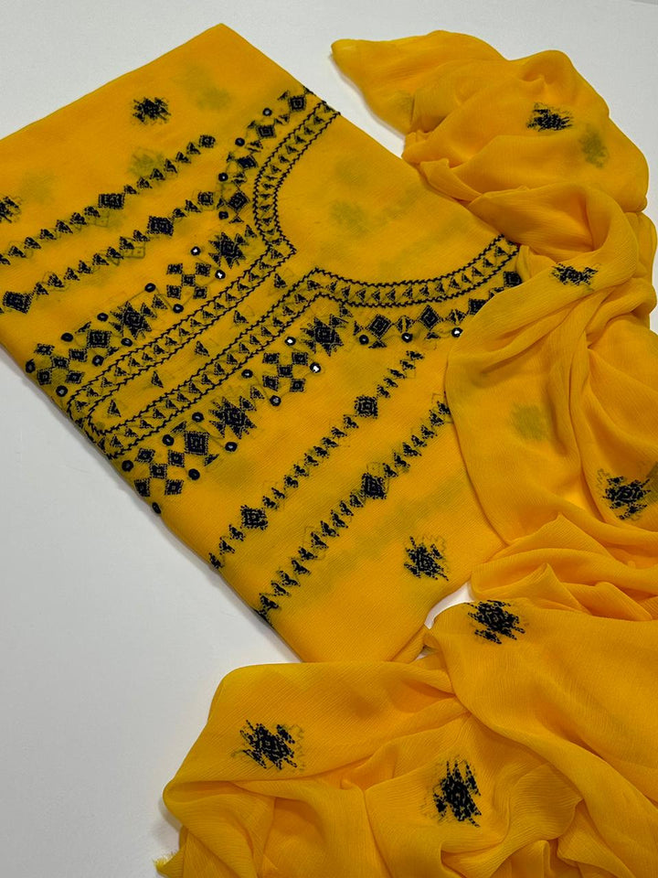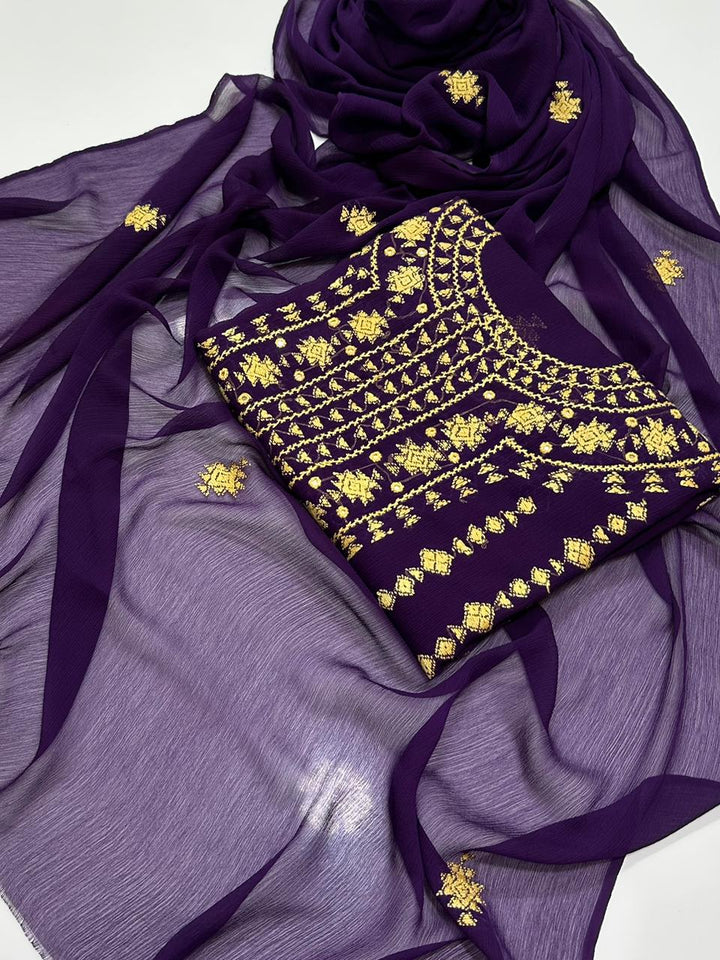 Embrace refined elegance with this premium handmade embroidered chiffon suit, expertly tailored for festive celebrations and semi-formal events. This 2-piece collection features 3 meters of intricately embroidered soft Bamber chiffon shirt paired with a generous dhai gaz dupata, offering both style and practicality. The delicate star embroidery showcases traditional craftsmanship, while the lightweight, breathable fabric ensures all-day comfort and graceful movement. Ideal for weddings, formal gatherings, and special occasions, this suit combines authentic handwork with contemporary design sensibilities, making it a distinguished addition to any formal wardrobe.