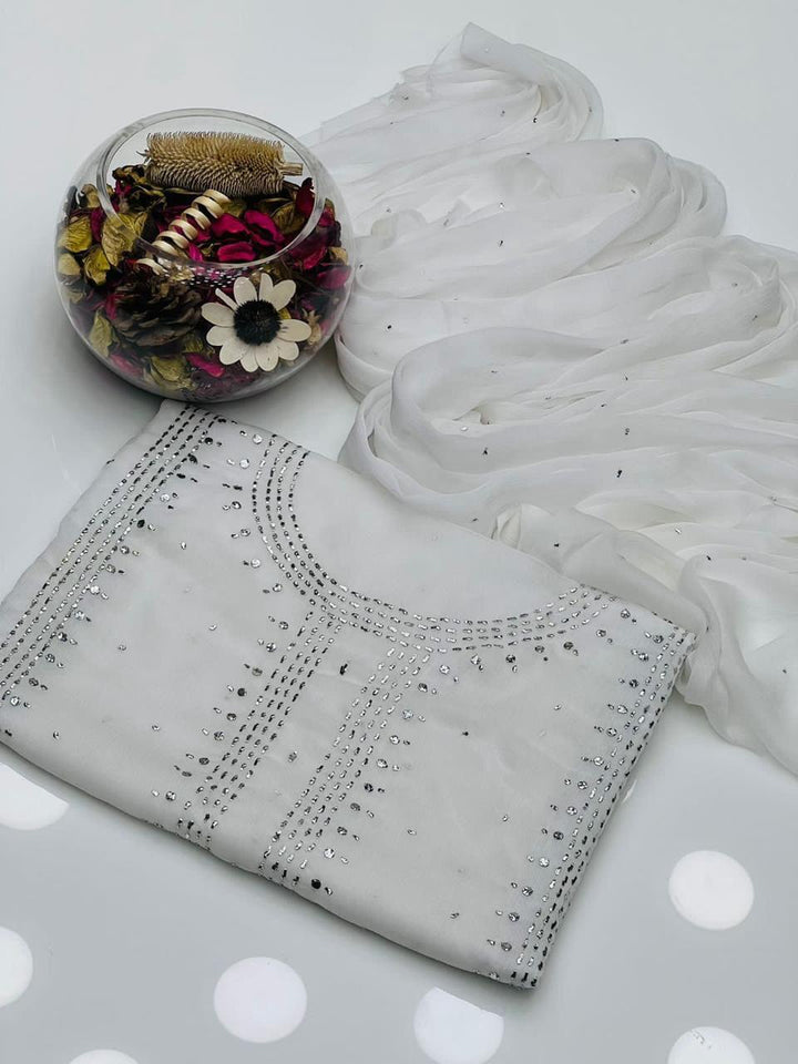Indulge in luxurious comfort with this exquisite two-piece chiffon dress featuring delicate mukesh embroidery work. Crafted from soft Bamber chiffon, the fabric drapes elegantly while maintaining a feather-light feel against the skin. The intricate mukesh detailing adds sophisticated sparkle and dimension, perfect for weddings, celebrations, and formal events. The breathable chiffon ensures all-day comfort without compromising on style, while the carefully executed embroidery showcases fine artisanal craftsmanship. This versatile ensemble effortlessly transitions from daytime gatherings to evening occasions, offering both grace and glamour in one stunning package.