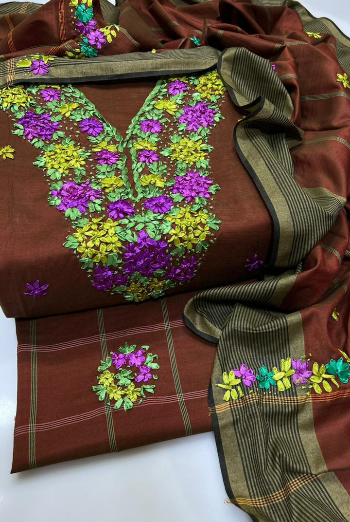 Discover refined elegance with this handcrafted three-piece suit featuring exquisite ribbon work embroidery from our Khadi Khaddar Collection. Artisans have meticulously applied delicate ribbon detailing to create dimensional, sophisticated patterns that catch light beautifully. Constructed from premium khadi and khaddar textiles, this ensemble delivers exceptional breathability and lasting quality. The ribbon work technique adds textural depth and visual interest, distinguishing this piece as a statement garment. Ideal for weddings, formal gatherings, and special occasions, this collection represents the pinnacle of traditional craftsmanship merged with contemporary aesthetic sensibilities.