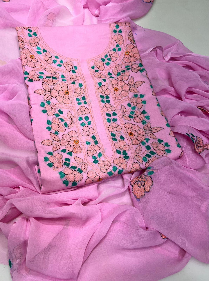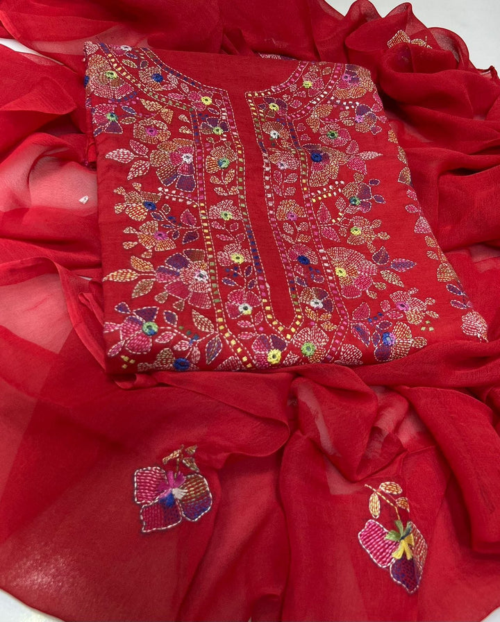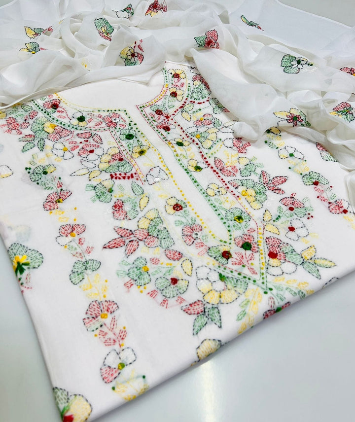 Elevate your wardrobe with this exquisite 3-piece hand embroidered lawn collection, meticulously crafted for the discerning customer. This ensemble features a premium 5-meter trouser, coordinating shirt, and 2.5-yard dupatta, each piece adorned with intricate hand embroidery that showcases traditional artistry. The breathable lawn fabric ensures comfort in warm climates while maintaining an elegant silhouette. Perfect for formal occasions, celebrations, or everyday sophistication, this collection combines timeless craftsmanship with contemporary style. Each garment is designed to complement one another, creating a cohesive, polished look that reflects refined taste and cultural heritage.